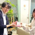 お客様の事務所の一角を即席の撮影スペースにして、小型のLEDライトで商品を照らしながら、三脚で固定したスマホを使って撮影しています。